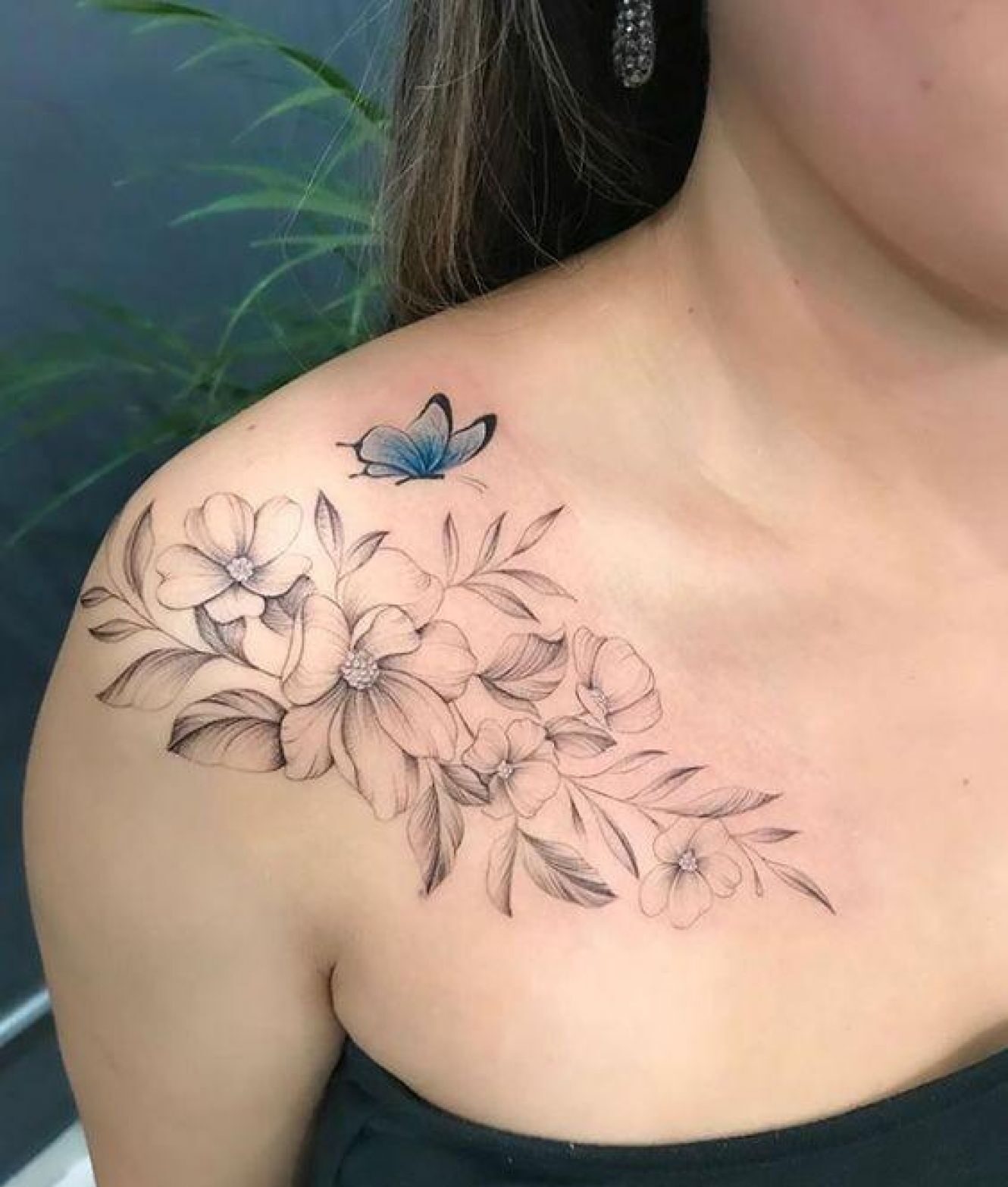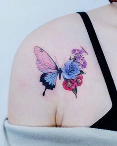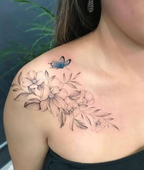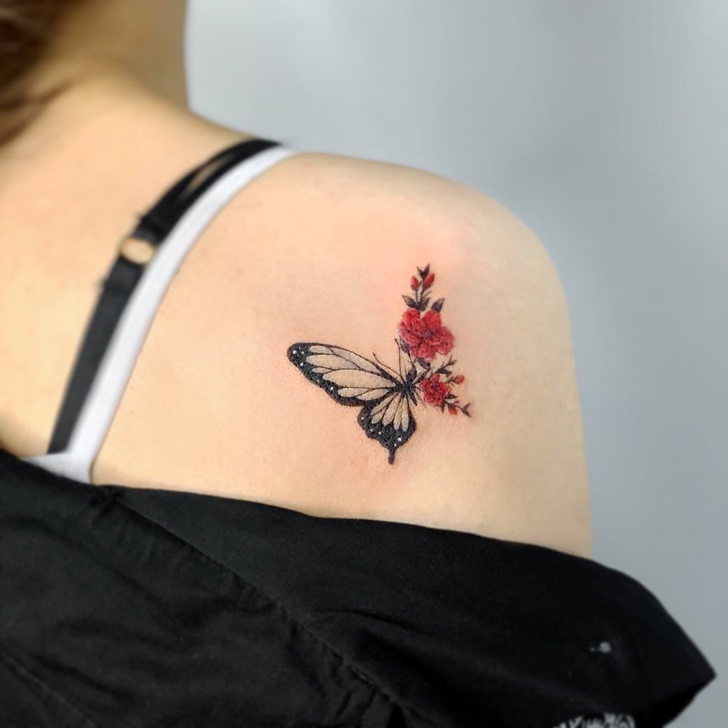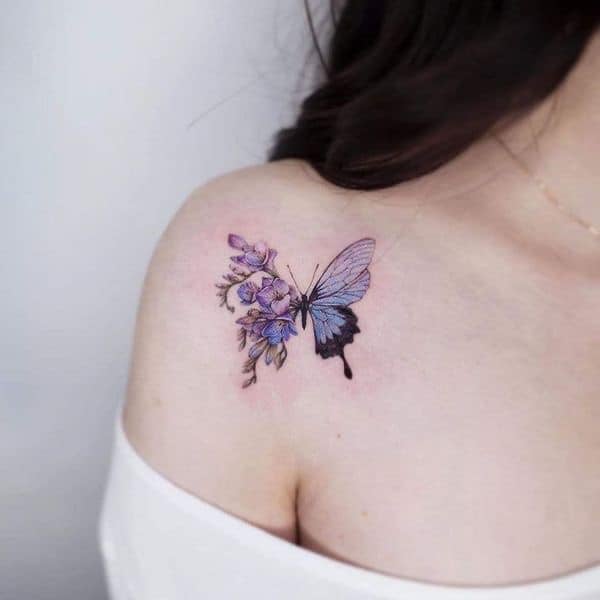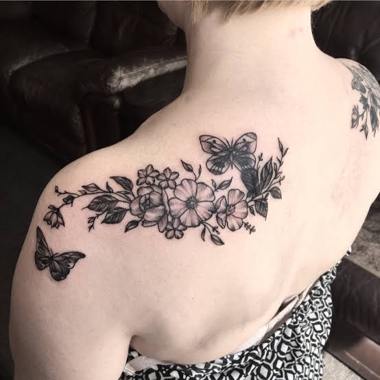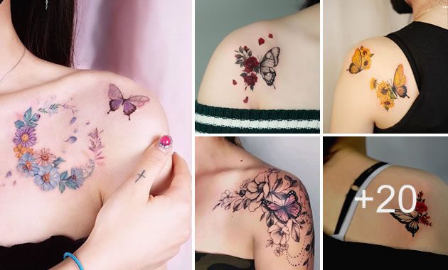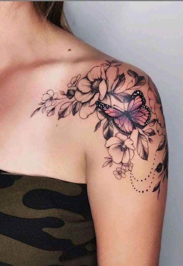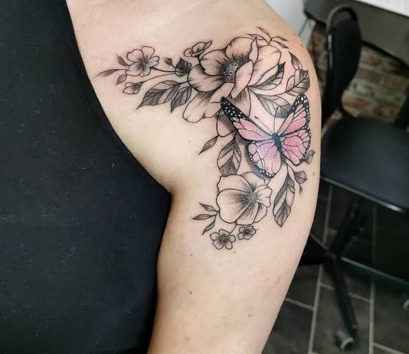 Elegantes y Bellos tatuajes de mariposas y flores en el hombro