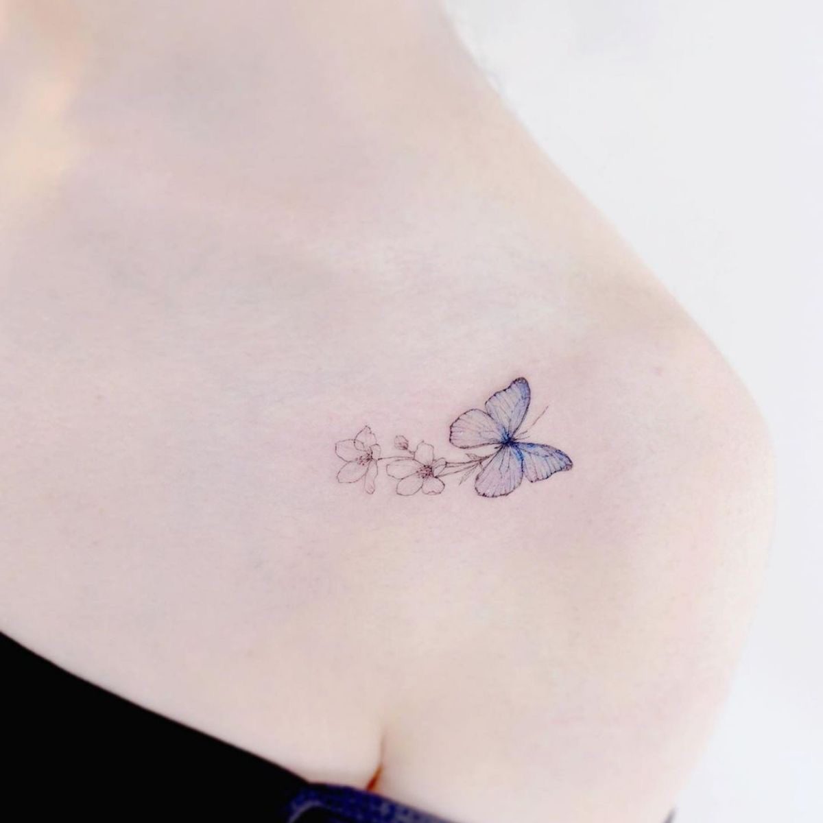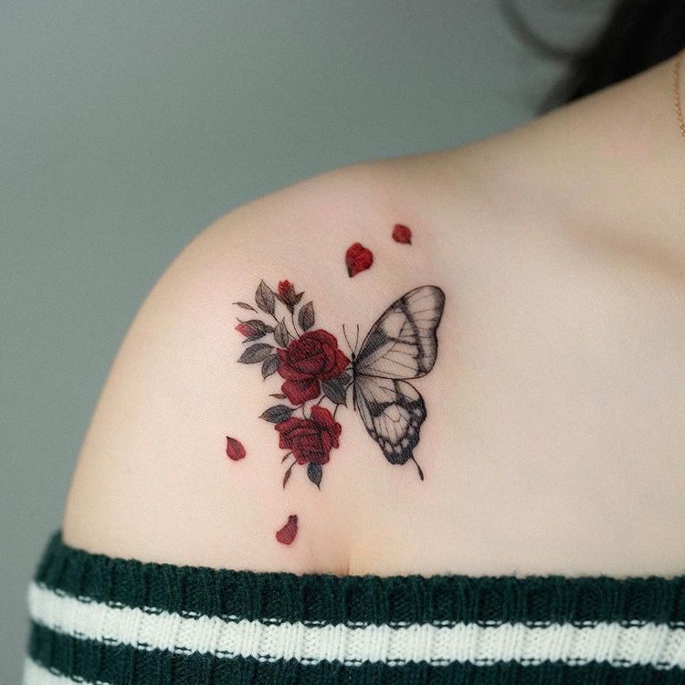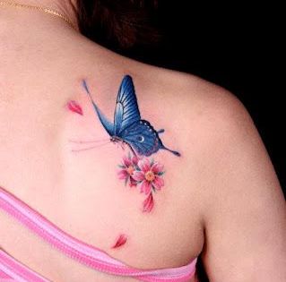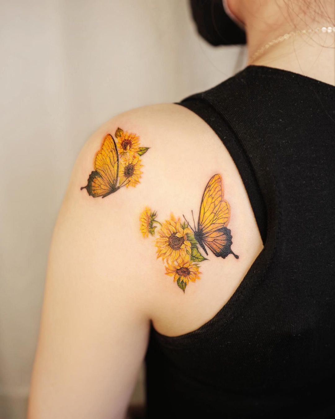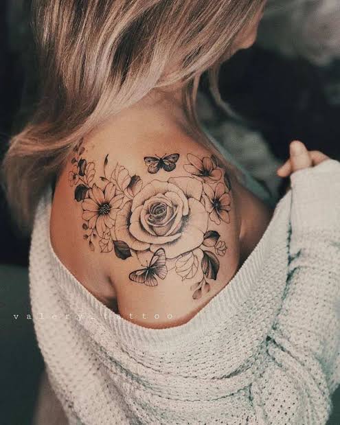 Elegantes y Bellos tatuajes de mariposas y flores en el hombro