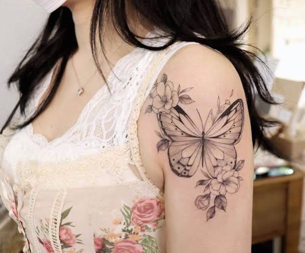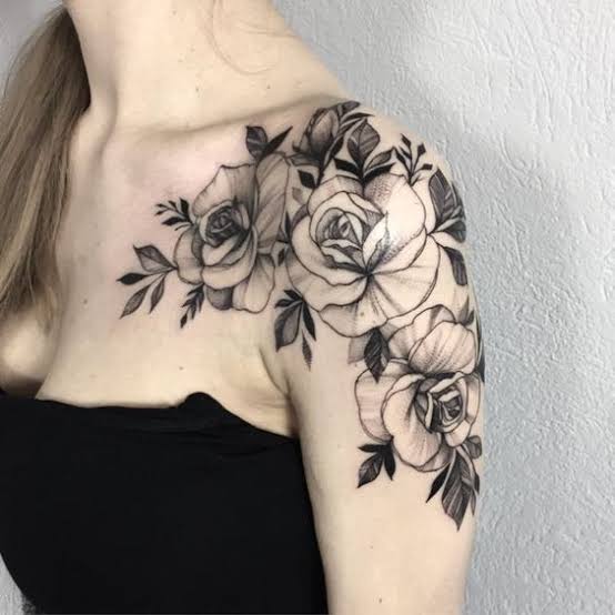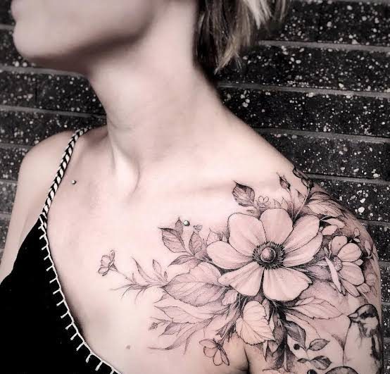 Tatuaje de flores en el hombro.